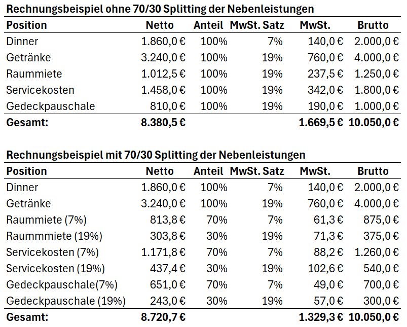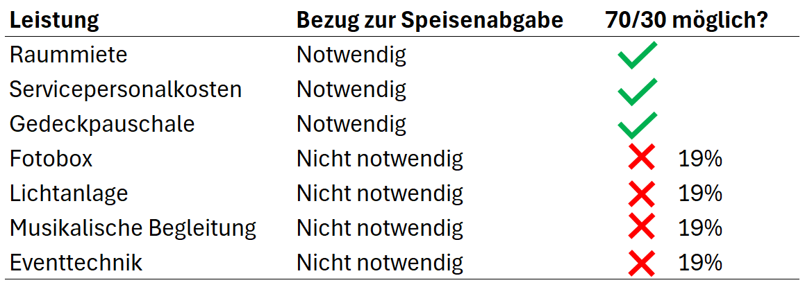 Laut Steuerberatung und BMF, können Nebenleistungen, die für die Speiseabgabe notwendig sind (z.B. Raumnutzung, Tisch-Setup, Service), analog zur Regelung für Kombiangebote, auch mit der 70/30 Regelung behandelt werden. Dies gilt explizit auch, wenn diese Nebenleistungen nicht Teil eines Kombiangebotes sind und diese Nebenleistungen zeitweise für andere Dinge als die Speisenabgabe genutzt werden.