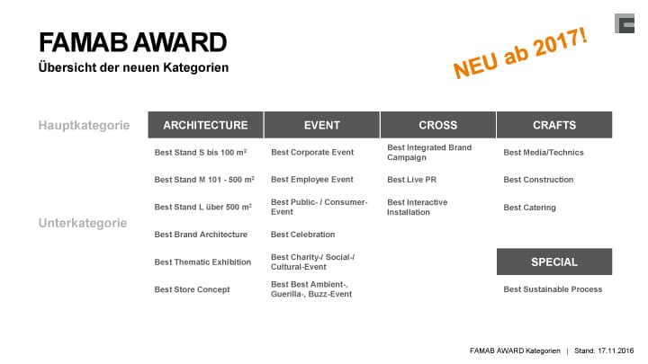 Folgende Änderungen der Kategorien treten ab dem FAMAB Award 2017 in Kraft: