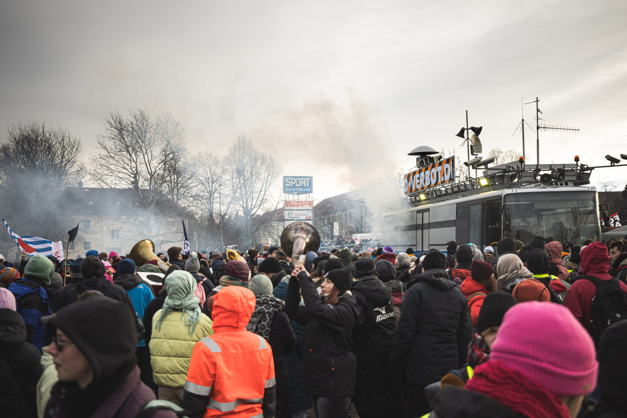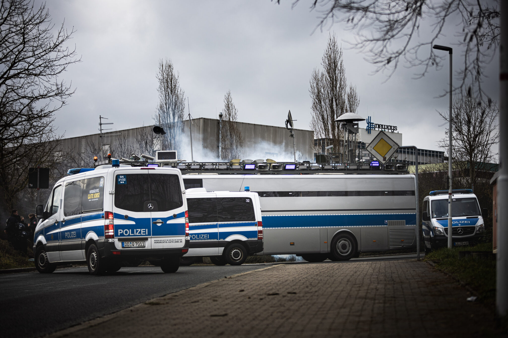 So auch am 11. Januar 2025 beim ersten „Kampfeinsatz“ in Riesa. Nach der 3-stündigen Polizeikontrolle ging es direkt zum Parteitag der AfD. Der Adenauer war dort off iziell für die Gegendemonstration angemeldet, sollte dort aber vorerst nicht ankommen. Bereits nachts wurde er von der Polizei in einem Gewerbegebiet unweit der Halle „festgesetzt“.