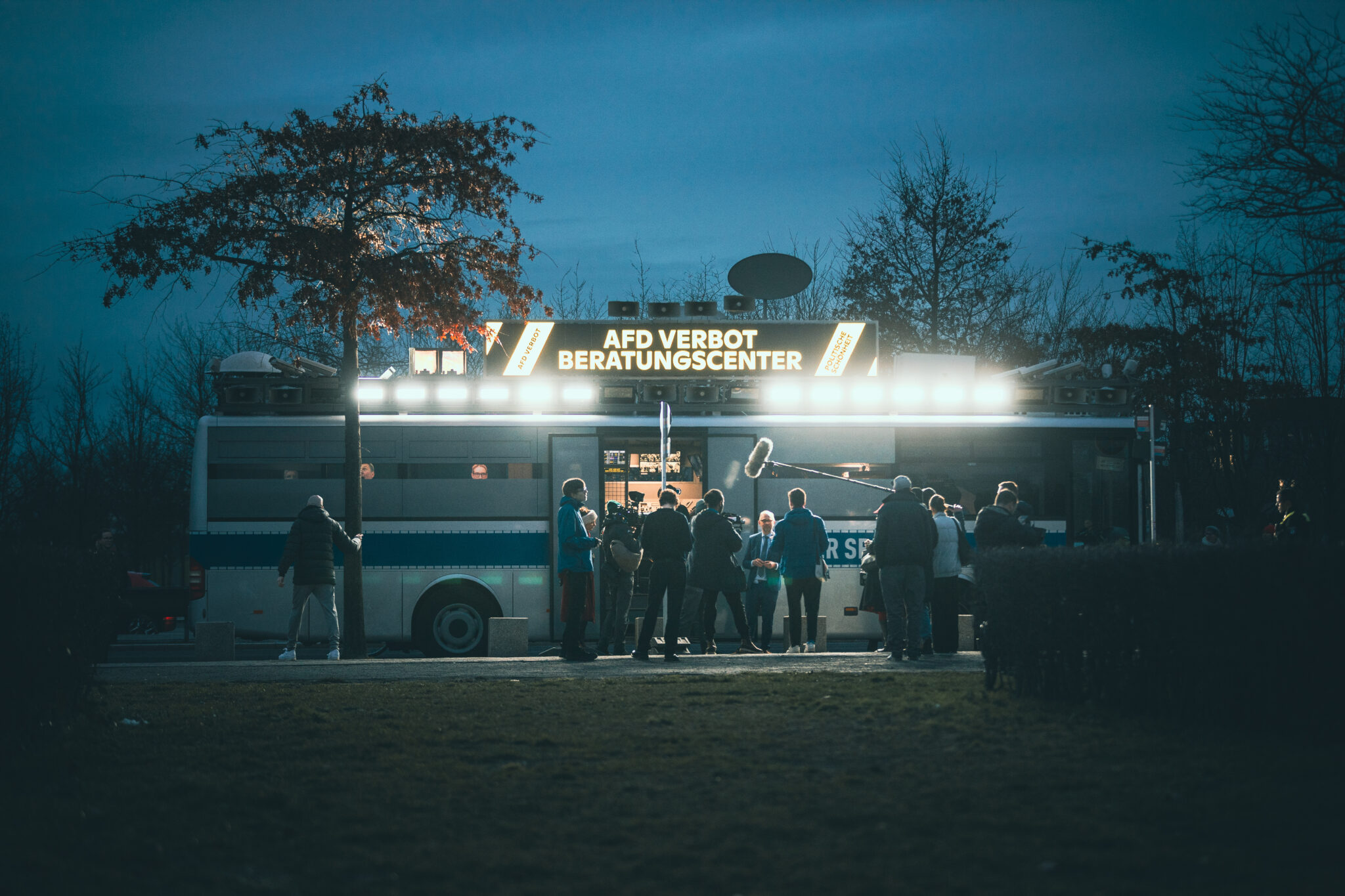Am Tag der Bundestagswahl haben wir zum Beispiel vor der Wahlparty der AfD protestiert. Um Punkt 18:00 Uhr, mit Bekanntgabe der ersten Hochrechnungen, haben wir mit unserer Sirene einen Katastrophenalarm gestartet und erst die Reaktion der Polizei hat aus einem Protest ein „Viral“ gemacht. Sie schlugen die Scheibe ein, stürmten den Bus und führten unser Team ab. Die Berichterstattung war enorm.