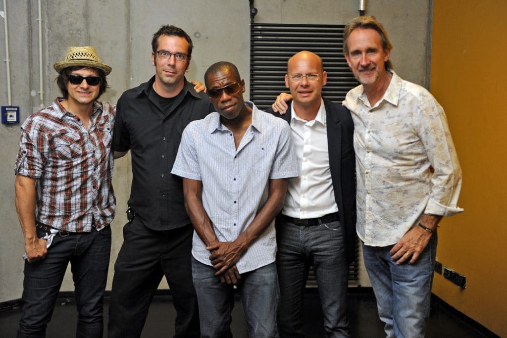 Stefan Lohmann zusammen mit „Mike and the mechanics“ in Berlin: Tim Howar, Stefan Lohmann, Andi Schwandtner, Mike Rutherford (v.l.n.r.) und Andrew Roachford (vorne). (Bild: Markus Wenzel )