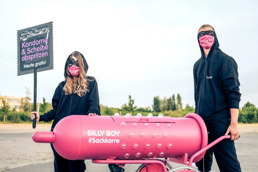 Billy Boy_Sackkarre_Autokino(Bild: Joke Event)Ein Nachbar von Arne Heyen ist Betreiber eines Autokinos in Oldenburg. So bekamen Joke Event und Billy Boy auf dem kurzen Dienstweg für den Abend des 2. Juni zu einem Freundschaftspreis von 500 Euro die Genehmigung, bei zudem passender Zielgruppe (Film „Nightlife“ u.a. mit Elyas M‘Barek), die Promotion-Aktion durchführen zu können. Die beiden Joke-Azubis waren hierbei als die Superhelden Billy Boy und Billy Girl verkleidet unterwegs und „achteten auf Sicherheit im Verkehr“, erzählt Heyen lachend. Wenn Autos im Autokino ankamen, wurden die Scheiben mit der umgebauten Sackkarre „abgespritzt“ und geputzt sowie mittels einer integrierten Zwille aus dem Angelladen kontaktlos Kondome verteilt. Neben dem Spritzen von Seifenwasser konnte die Sackkarre auch Silberregen-Bühnenpyro abschießen, Bier zapfen, hatte einen eingebauten Konfetti-Shooter und besaß eine integrierte Musikanlage wie auch Beleuchtung. Daneben war im Inneren genug Platz für den Transport des gesamten Promotion-Materials. Ein Multifunktionstalent.