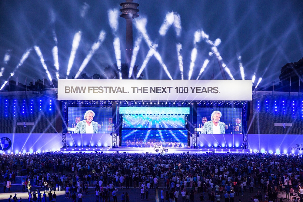 3, 2, 1… der Countdown läuft auf der knapp sechs Meter breiten LEDWand, ein Feuerwerk erhellt das Olympiastadion, der Startschuss für die nächsten 100 Jahre ist gefallen. Die BMW Festival Night im Olympiastadion als Highlight des Jubiläumsjahres. Mit einer Kombination aus Mobilitäts- und Musikgeschichte wurde das Publikum von Moderator Thomas Gottschalk zu den wichtigsten Stationen in der Entwicklung der BMW Group geführt. Als Protagonisten dieser Jahrhundertshow traten hochkarätige Musik- und Show-Künstler gemeinsam mit legendären Automobilen und Motorrädern auf, die über große Auffahrrampen auf die Bühne kamen. Das Programm umfasste klassische Klänge von den Münchner Philharmonikern sowie der Sopranistin Eva Lind wie auch Rock’n’Roll von Peter Kraus, einen Auftritt der vierfachen Breakdance-Weltmeister Flying Steps, von Simply Red, Lena und Sunrise Avenue. Den Schlussakkord der Jahrhundertshow setzte das Duett von Samu Haber, Frontmann von Sunrise Avenue, mit dem SingerSongwriter Niila, die als Weltpremiere den speziell für das Jubiläumsfest der BMW Group geschriebenen Titel „A Hundred Years“ präsentierten, begleitet von einzigartig choreografierter Pyrotechnik. Ein emotionsgeladener Abend mit grandiosem Publikum, ganz im Zeichen kommender Erfolge.