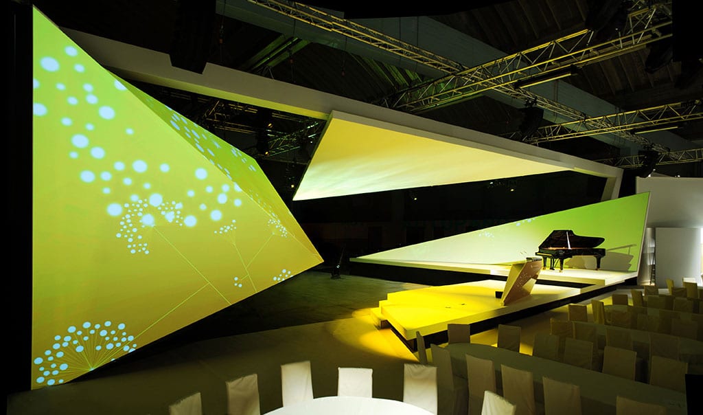 Ich glaube, dass es nicht unbedingt eine Budget-Frage ist. Natürlich ist ein geometrisch komplexeres Bühnenbild auch kosten-aufwändiger als eine gerade Wand. Aber da kann man immer noch mit dem Material gucken. Wir gehen grundsätzlich so vor, dass wir das Budget erst einmal nicht so sehr in den Mittelpunkt stellen. Wenn wir eine gute Idee, ein gutes Konzept haben, dann suchen wir nach Lösungen, wie wir das mit dem betreffenden Budget umsetzen. Um Lösungen zu finden, die tiefer gehen, ist eine sehr intensive Auseinandersetzung mit den Unternehmensinhalten, die dargestellt werden sollen, mit dem Bühnenpro-gramm, mit dem gegebenen Raum notwendig. Eine komplexere Geometrie ist ja nicht willkürlich ortsunabhängig. Sie orientiert sich am umgebenden Raum, an den Blickwinkeln der Zuschauer, am Bühnenprogramm, an der Größe der Projektion, an den Möglichkeiten, mehr Projektion einzusetzen. Das ist eine tiefe Auseinandersetzung, ein langer Prozess, den viele nicht gehen wollen oder können. Das Budget betrifft ja auch unsere Planungszeit und die ist bei uns etwas länger als bei anderen. Denn wir verfolgen immer das Ziel, eine außergewöhnliche Lösung zu finden.