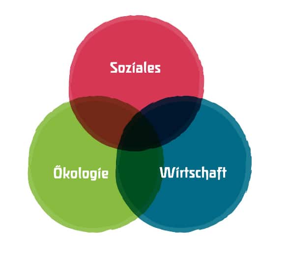 Nach dem Drei-Säulen-Modell besteht Nachhaltigkeit gleichberechtigt und untrennbar aus ökologischen UND wirtschaftlichen UND sozialen Aspekten.