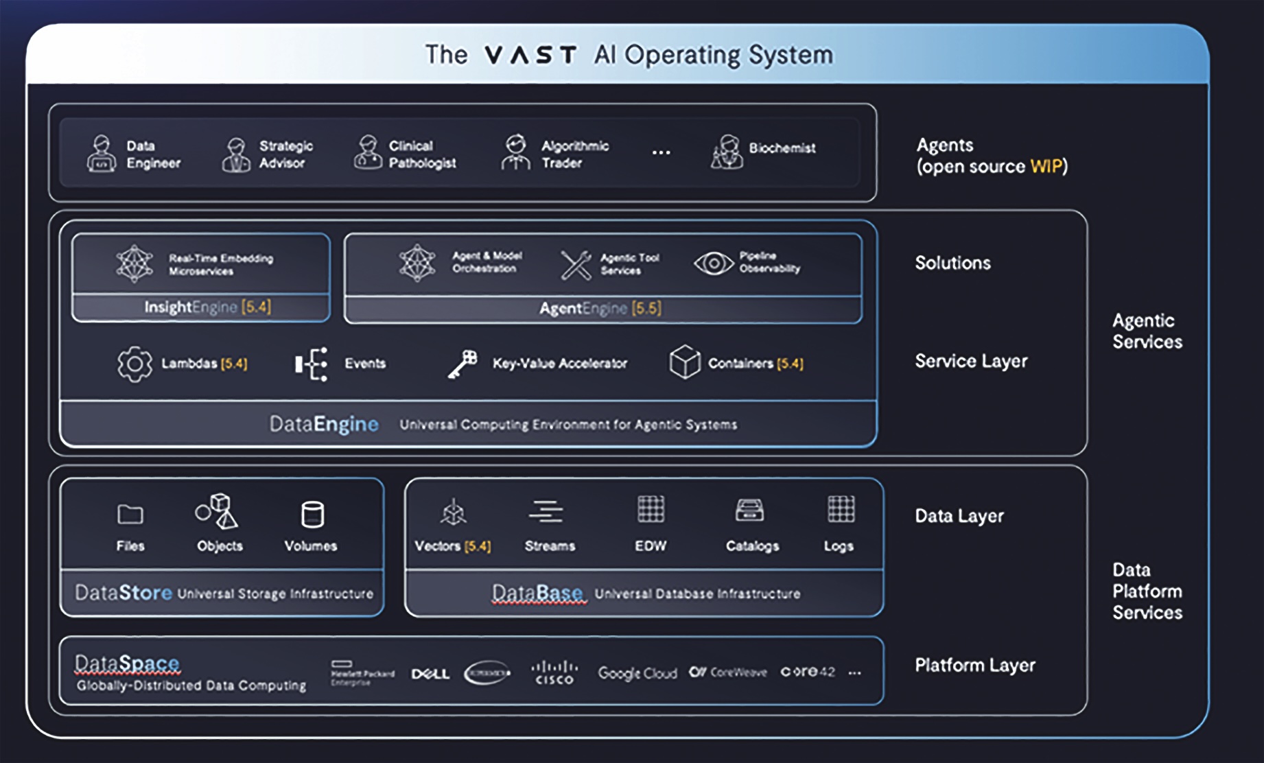 Das Betriebssystem umfasst unter anderem einen Kernel für private und öffentliche Cloud-Umgebungen, eine Runtime für KI-Agenten, Eventing- und Messaging- Infrastrukturen für Echtzeitverarbeitung und ein verteiltes Speicher-Subsystem für die Echtzeit-Analyse großer Datenmengen. Ein besonderes Modul ist die AgentEngine, eine skalierende Laufzeitumgebung für Agenten mit Low-Code-Oberfläche. Sie erlaubt die Erstellung intelligenter Workflows, das Management von Personas sowie den Zugriff auf Daten, Webdienste oder andere Agenten via MCP-kompatible Tool-Schnittstellen. VAST stellt dazu eine wachsende Sammlung vorgefertigter Open-Source-Agenten bereit – darunter Assistenten für Data Engineering, Prompt-Optimierung, Compliance und biomedizinische Forschung.