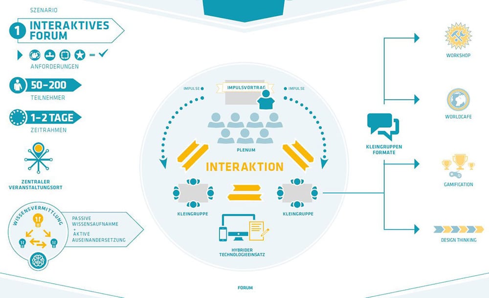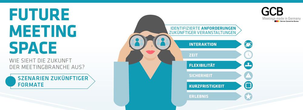 Um diese Fragen grundsätzlich zu klären und der Branche konkrete Handreichungen und Konzepte zur Verfügung zu stellen, hat sich der Innovationsverbund „Future Meeting Space“ gebildet. Der Zusammenschluss aus dem German Convention Bureau (GCB), dem Fraunhofer IAO und dem EVVC Europäischer Verband der Veranstaltungs-Centren e.V. hat Anfang 2015 mit einem Projekt zur Erstellung mehrerer Anforderungsprofile für Veranstaltungen begonnen. Nachdem im Juni 2016 die Analysephase von erfolgversprechenden Meeting-Szenarien beendet wurde, sollen nun einige von ihnen umgesetzt und auf ihre Tauglichkeit hin überprüft werden. Die Analyseergebnisse hat das GCB in einer Infografik zusammengefasst. Sie veranschaulicht sechs Szenarien, die für die Meetingbranche wesentlich sein werden. Im Einzelnen sind das „Interaktives Forum“, „Räumlich-verteilter Kongress“, „Co-Working Kongress“, „Analoger Kongress“, „Hybrider Kongress“ und „Virtual goes Real“. Die Formate werden in Bezug auf die Faktoren Interaktion, Zeit, Flexibilität, Sicherheit, Kurzfristigkeit und Erlebnis eingeordnet.