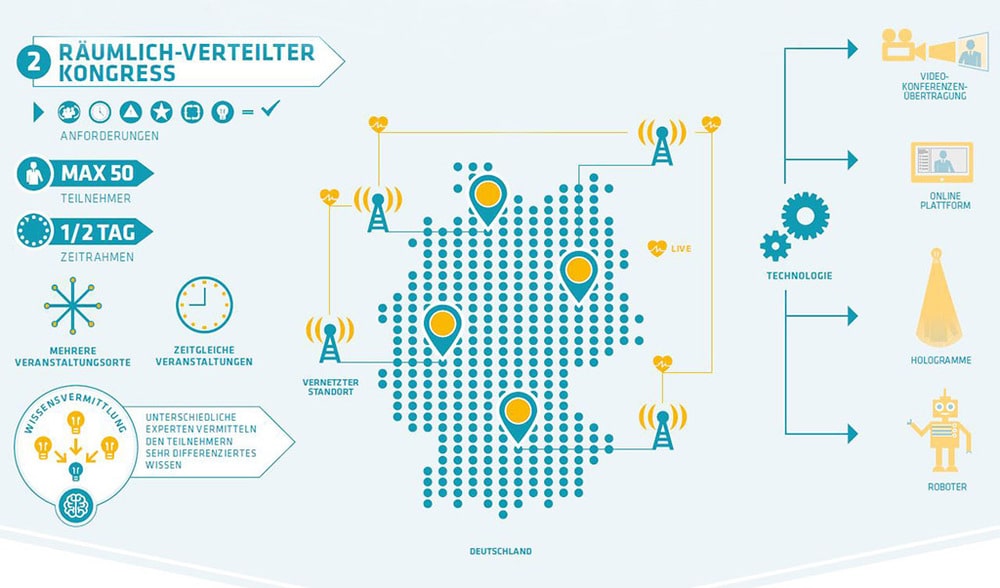 Im Unterschied dazu spielt sich dieses Format an mehreren Orten gleichzeitig ab. Mit nicht mehr als 50 Teilnehmern und einem Zeitrahmen von einem halben Tag ist es kleiner dimensioniert als ein ZentralEvent. Hier werden die Teilnehmer gleichzeitig durch Video-Conferencing oder mit Hilfe von Online-Plattformen vernetzt. Dabei können unterschiedliche Experten ein sehr differenziertes Wissen vermitteln. Neben der Online-Verbindung sollen auch weitere technische Mittel wie Roboter oder holografische Verfahren eingesetzt werden. Ob interaktive Displays an Roboterarmen für Informationsvermittlung, Nebelprojektoren oder Hologramme für Produktpräsentationen oder Showeffekte, kann auf das jeweilige Anforderungsprofil der Veranstaltung zugeschnitten werden.