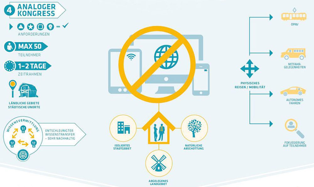 Wer besonderen Wert auf Verschwiegenheit und Daten – sicherheit legt, wird für nicht mehr als zwei Tage maximal 50 Teilnehmer zu einem analogen Kongress laden. Für diffizile Firmeninterna oder auch nur die ungestörte intensive Vermittlung von Wissen ist dieses Retro-Format ideal. Konsequenterweise sollten als Veranstaltungsort eine Location auf dem flachen Lande oder ein städtischer Un-Ort wie eine Industriebrache gewählt werden. Wichtig ist der Umstand, die Veranstaltung an einem isolierten Ort durchführen zu können, ohne Störungen und Ablenkungen.