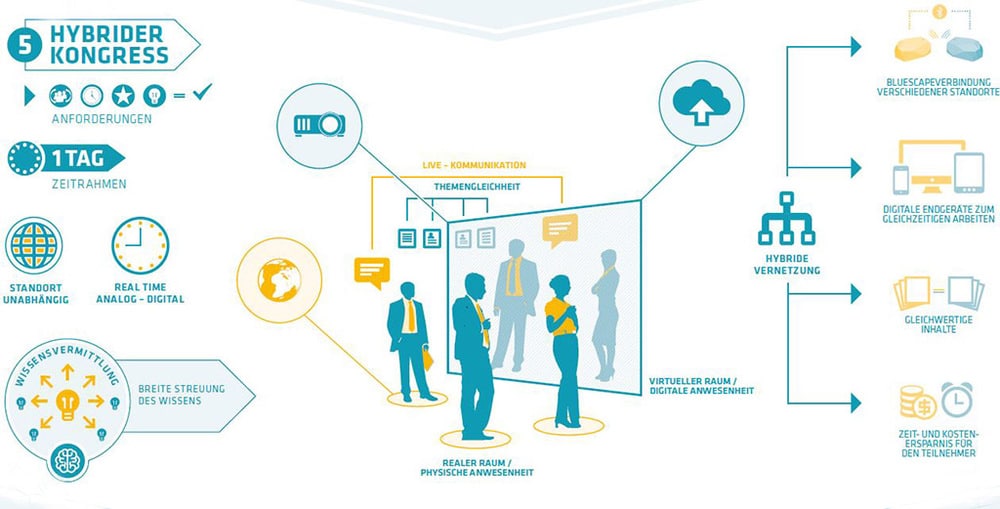 Das genaue Gegenteil zum Analogevent ist der hybride Kongress, bei dem ganz bewusst sämtliche Register moderner Technik gezogen werden. Einen eigentlichen Veranstaltungsstandort oder eine festgelegte Teilnehmerzahl für dieses in der Regel auf einen Tag begrenzte Event gibt es nicht mehr. Die Vermittlung von Wissen, Inhalten und der Austausch mit anderen Teilnehmern können gleichzeitig auf verschiedene Weise erfolgen. Mit den am jeweiligen Ort Anwesenden kann natürlich direkt gesprochen werden. Die Interaktion mit Entfernten wird dann durch Smartphones, Tablets oder Notebooks erledigt. Gemeinsame Anbindung und Austausch können durch Apps erleichtert, der Auftritt von Referenten oder die Vermittlung von Inhalten kann durch verschiedenste Präsentationstechniken erweitert und bereichert werden.