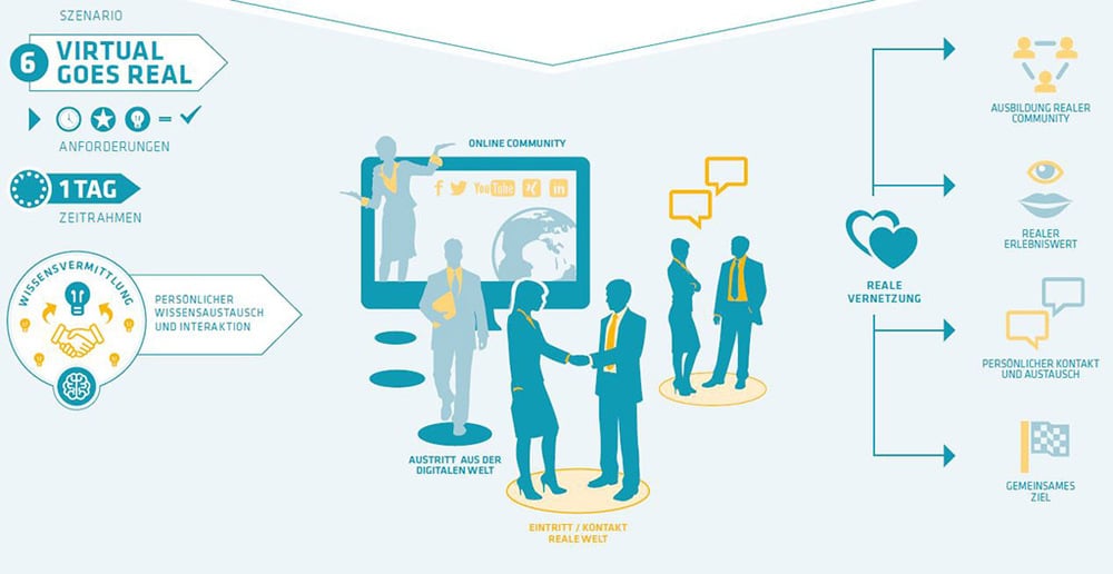 Auch dieses Szenario setzt ganz auf die technischen Möglichkeiten der Stunde. Allerdings stellt die Nutzung der Online-Möglichkeiten keinen Selbstzweck dar, sondern soll lediglich den Ausgangspunkt für die Rückkehr zur wirklichen Begegnung zwischen Menschen bilden. Die Teilnehmerzahl ist in diesem Rahmen nicht festgelegt, die Dauer wird auf einen Tag veranschlagt. Nutzer, die sich bislang nur über soziale Netzwerke wie Facebook, Twitter oder Plattformen wie YouTube und Instagram getroffen haben, sollen sich leibhaftig gegenüber stehen. Durch den persönlichen Kontakt soll die Vermittlung von Inhalten und Wissen auf eine intensivere Ebene gehoben werden. So kann eine reale Community entstehen, was auch einen im Vergleich zum Kontakt über Computerdisplays viel höheren Erlebniswert gewährleisten soll.
