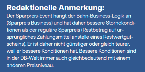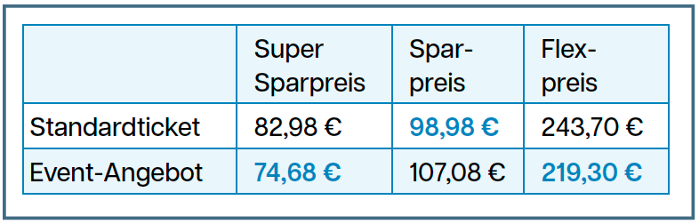 Der günstigere Preis ist jeweils blau markiert. Ergebnis: Der Super Sparpreis und der Flexpreis ist bei der Eventvariante jeweils rund 10 % günstiger. Der Sparpreis ist in der Eventvariante aber mehr als 8 Euro teurer!