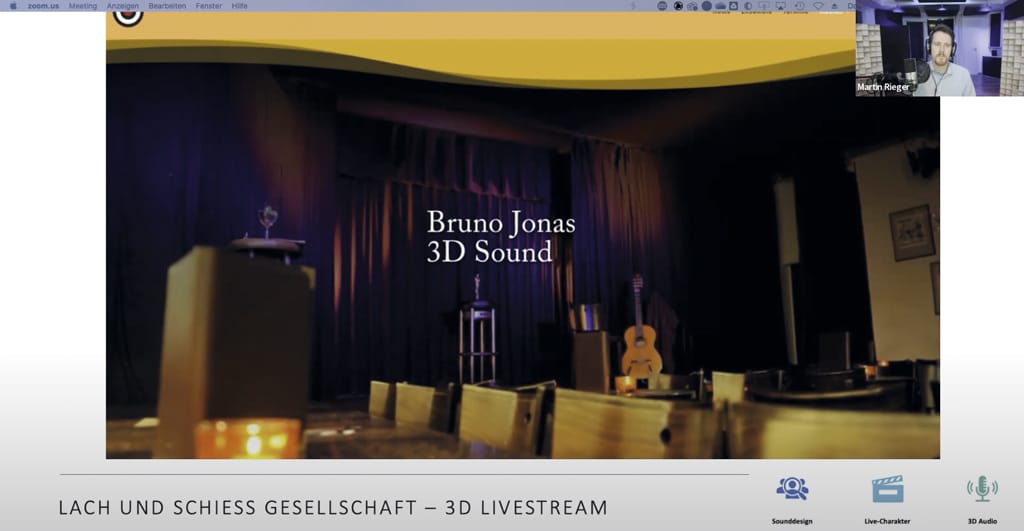 Inspiriert von erfolgreichen Late-Night-Shows wurde eigens für diesen Anlass ein 200 m2 großes TV-Studio entworfen und gebaut. Moderiert von der Comedienne Hazel Brugger sowie Oliver Kahn bekamen die virtuellen Gäste bei diesem Event noch etwas Besonderes geboten: 3D-Audio über Kopfhörer. Durch den dreidimensionalen Klang wurden die Mitarbeitenden auf eine akustische Reise geschickt und konnten die Geschichte von Innovation, Digitalisierung und DACH-Region in einer fesselnden 7-Minuten-Performance genießen. Kopfhörer aufsetzen und Augen zu – eine willkommene Abwechslung, binaurales Audio macht es möglich.