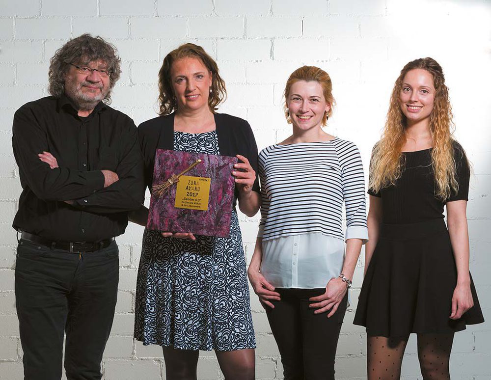 Die glückliche Preisträgerin Daniela Wilken (2. v.l.) umringt von Dr. Walter Wehrhan, Martina Gawenda und Sylvia Koch (v.l., alle EVENT PARTNER), die stellvertretend für die Event-Zora den Award überreicht haben. (Bild: Marlon Storck )