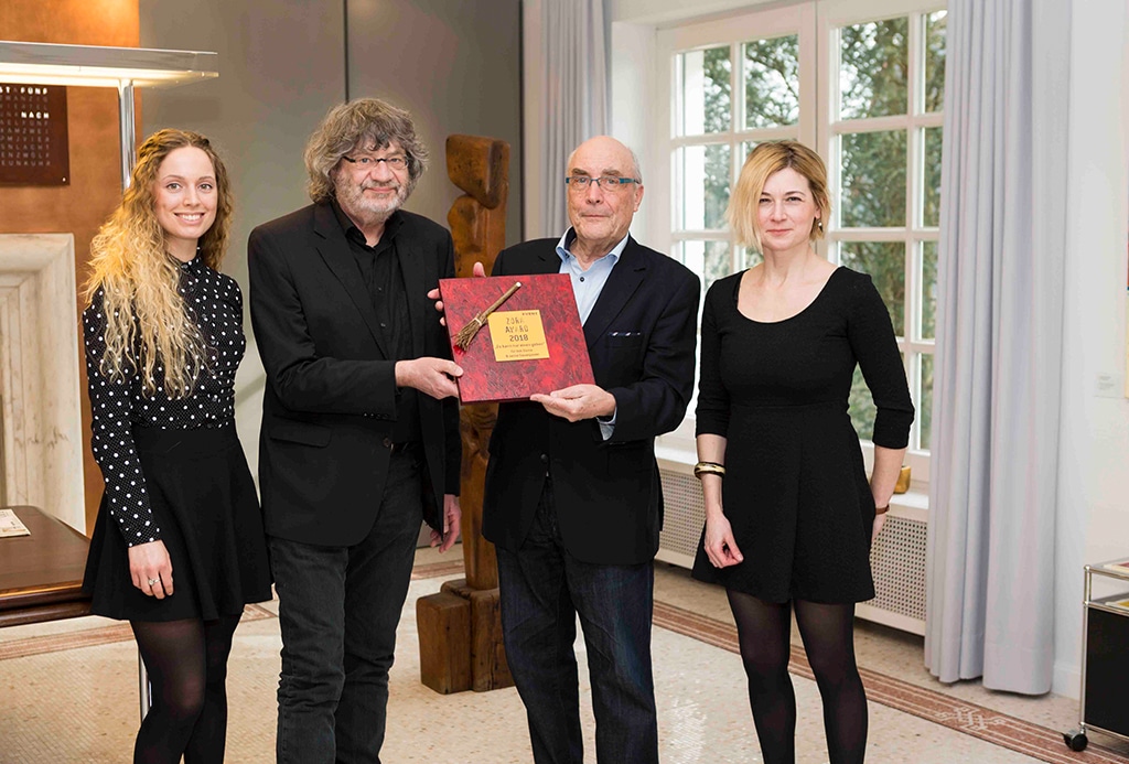 Vok Dams nimmt in seinem Wuppertaler Atelierhaus den Zora Award entgegen – für seinen unermüdlichen Einsatz und seine “Dauerpower”. (Bild: Dieter Stork)