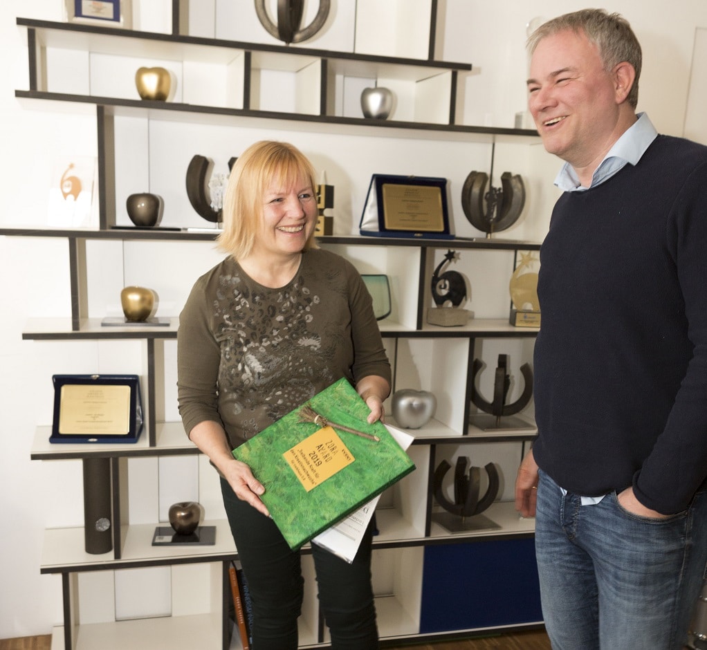 Annette Beyer und Christian Poswa (GF Insglück) freuen sich gemeinsam über den ZORA AWARD 2019 – Insglück unterstützt als Partner-Agentur treibhaus 0.8 (Bild: Dieter Stork)