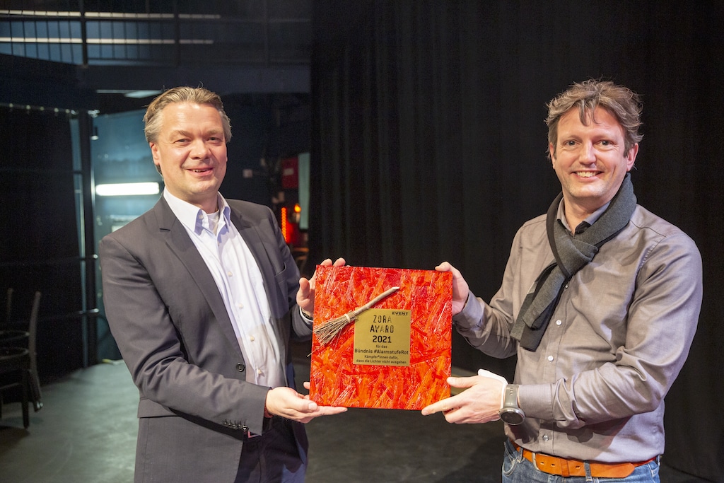 Christian Seidenstücker und Alex Ostermaier nahmen den ZORA AWARD für #AlarmstufeRot, Kämpfer:innen dafür, dass die Lichter nicht ausgehen, entgegen. (Bild: Marcel Courth)