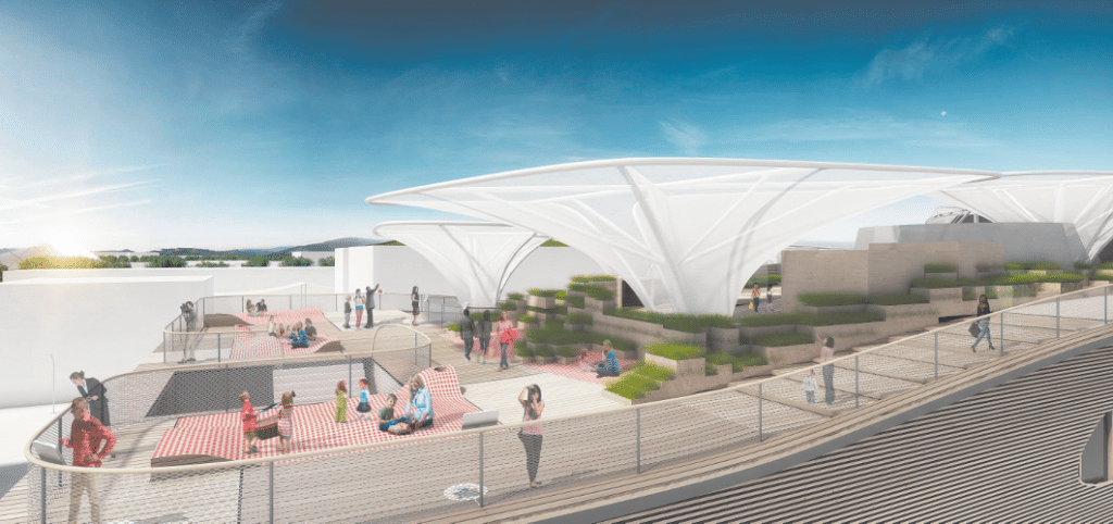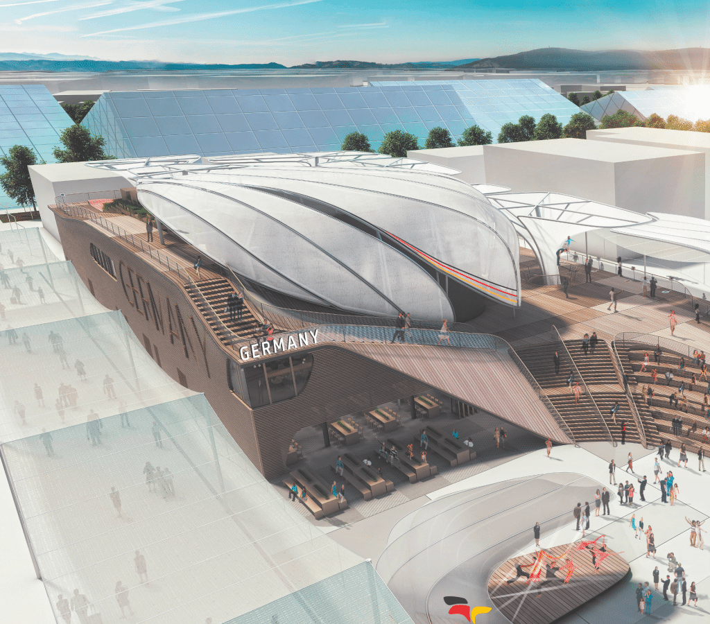 Diesen Anspruch greift das Team des deutschen Pavillons auf. Auf einem Grundstück von 4.913 m² entsteht der 12 Meter hohe Bau, der sich in einen Außen- und einen Innenbereich aufteilt. Beide können durch eine doppelte Wegeführung getrennt besichtigt werden: Über eine breite, sanft ansteigende Rampe aus heimischen Hölzern gelangen Besucher auf das Außendeck, das u. a. ein Restaurant mit regionalen Spezialitäten und Möglichkeiten zum Picknicken und Flanieren bietet. Diese Landschaftsebene ist in der Optik rechteckiger Felder gehalten, die sich durch unterschiedliche Brauntöne abzeichnen. Ein weiteres architektonisches Highlight zeigt sich ebenfalls auf der äußeren Landschaftsebene: Ausladende weiße Membrandächer stellen die Form aufstrebender Pflanzen nach und sollen so das Heranwachsen neuer Ideen symbolisieren.