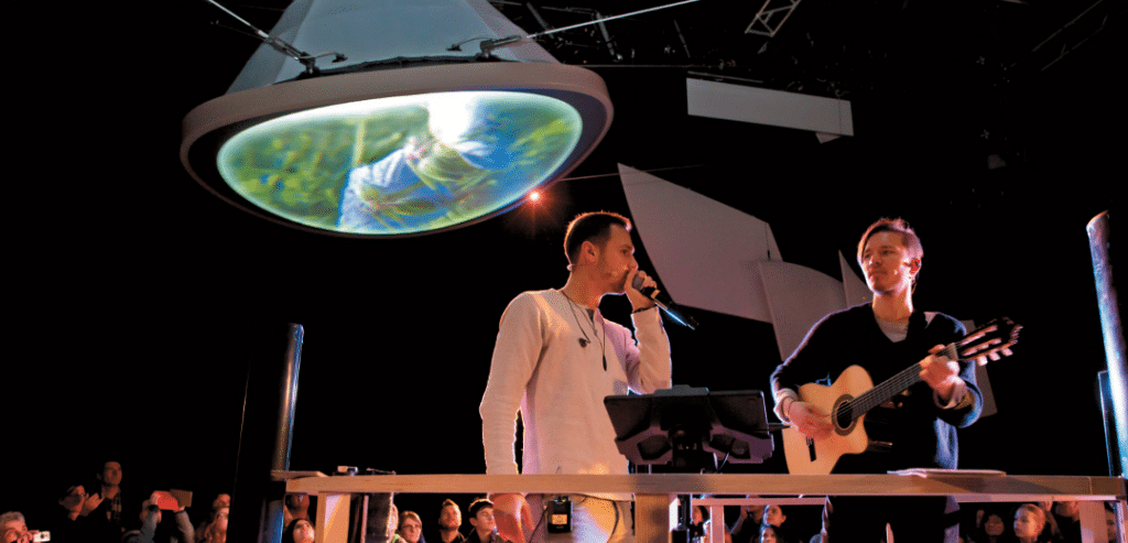 Der Pfad mündet zum Schluss im Highlight der Ausstellung: Der interaktiven Live-Show „Be(e) active“, bei der das Publikum nicht nur eine ungewohnte Perspektive einnimmt, sondern den Klang der Show auch selbst erzeugt. Während ein Gitarrist und ein Beatboxer, genannt „BeeJ‘s“, die Menge dazu animieren sollen, mit verschiedensten Mitteln Naturgeräusche zu erzeugen, zeigen zwei Seilroboter eine realistische Projektion eines Bienenflugs aus den Augen des Insektes. Die Roboter sind so programmiert, dass sie in sanften Flugbewegungen über die Köpfe des Publikums hinweg schweben. Durch die Projektion und die unterstützende Geräuschkulisse entsteht eine beinahe magische Atmosphäre, die sich bei den Besuchern mindestens so stark einprägt wie die außergewöhnliche Architektur des Pavillons.