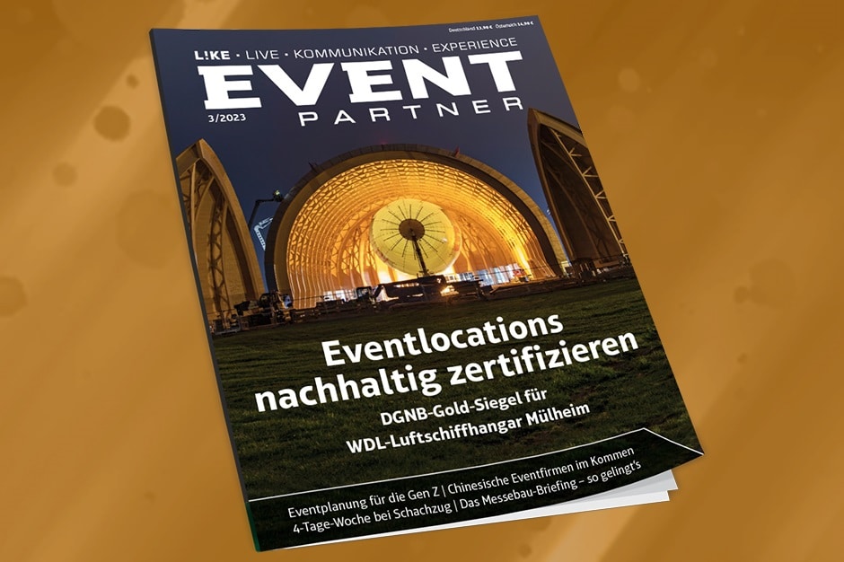 Das DGNB-Siegel in Gold strebt gerade die WDL-Gruppe mit ihrem Hangar in Mülheim an der Ruhr an. Der multifunktionale Holzkomplex bietet dank der zirkulären Bauweise nicht nur Luftschiff „Theo“ ein möglichst nachhaltiges Zuhause, sondern zudem Raum für Veranstaltungsformate mit bis zu 1.500 Personen. Wir haben den Hangar vor Ort besichtigt und uns das Prüfsiegel genauer angesehen – mehr hierzu gibt es in der EVENT PARTNER 3.2023 zu lesen. In der Ausgabe beschäftigen wir uns u.a. auch mit den Ansprüchen der Gen Z an die Veranstaltungsplanung, dem chinesischen Messe-Business, der Work-Life-Balance in der Eventagenturbranche und den Anforderungen an ein Messebau-Briefing.