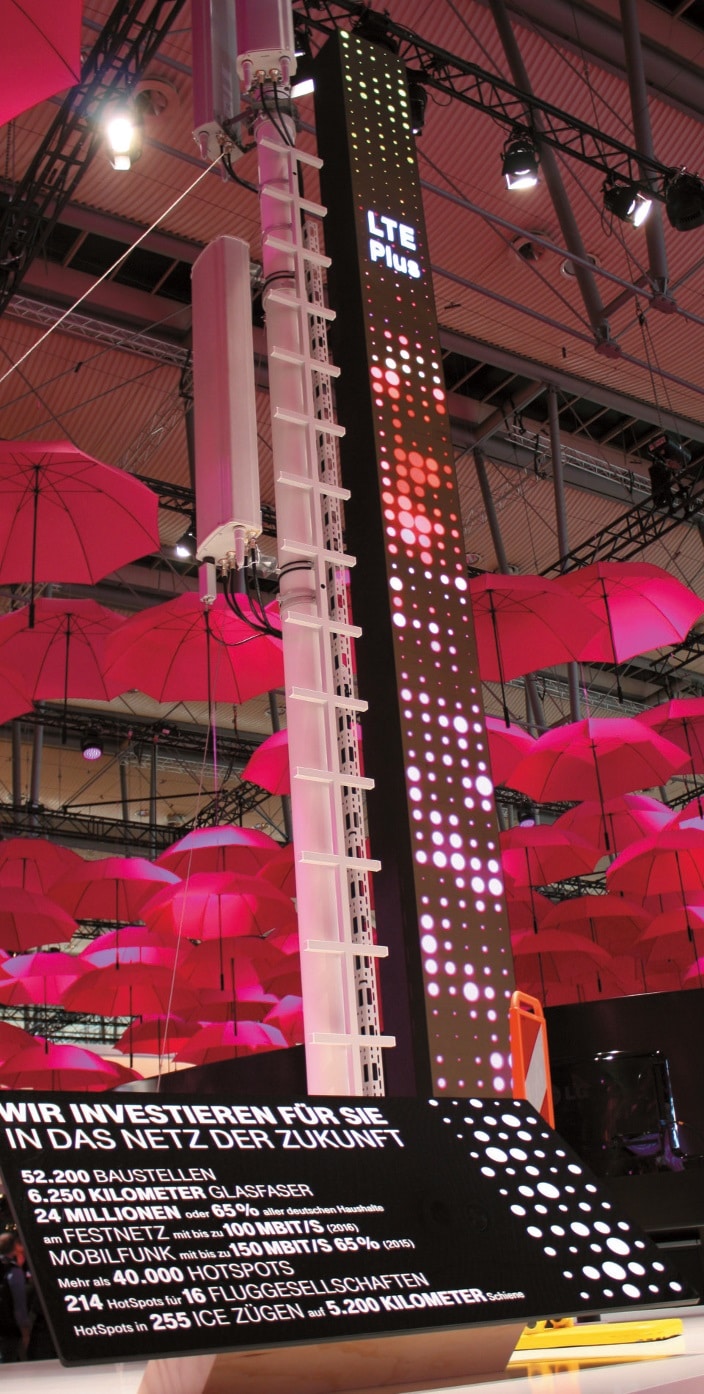 Ein halbes Jahr Vorbereitungszeit steckte in dem Messeauftritt des Bonner Telekommunikationsriesen auf der CeBIT, dazu ein Monat Aufbauzeit. Allein das Aufhängen des symbolischen „Marken-Schirms“ dauerte drei Wochen. Es gibt einen Lageplan, auf dem jeder Schirm eine Nummer hat und ganz bewusst positioniert ist, so dass Bewegung in den Raum kommt. Das Sinnbild hinter diesem magentafarbenen Himmel: Zuverlässigkeit im Service, kompetenter Schutz und beste Netzabdeckung. Der Mut zur Experimentierfreudigkeit in der Standgestaltung wurde durch den Messebesucher belohnt: Der Markenauftritt der Telekom kam – laut Auswertung der Befragungen der Standbesucher vor Ort – im Wettbewerbsvergleich deutlich besser an, 74 % der Befragten beurteilten ihn als „sehr positiv“ oder „positiv“. Die Beratungsquoten konnten um 50 % gesteigert werden.