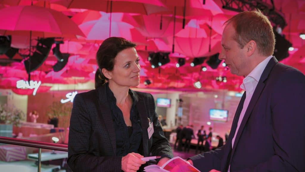 EVENT PARTNER sprach mit Antje Hundhausen, der Leiterin 3D Brand Experience, sowie Heiko Gerbers, dem Leiter Messen. Antje Hundhausens Zuständigkeitsbereich umfasst alles, was temporäre Markenerlebniswelten beinhaltet, so etwa das Standbausystem der 600 Messebeteiligungen der Telekom, die Arbeitswelten der Zukunft, das Kunstmanagement wie auch die Übertragung der Live-Elemente aus den Testplattformen in die Shop-Welten. Heiko Gerbers zeichnet verantwortlich für die drei großen Messen Mobile World Congress, CeBIT und IFA sowie die Richtlinien für die regulären Messebeteiligungen.