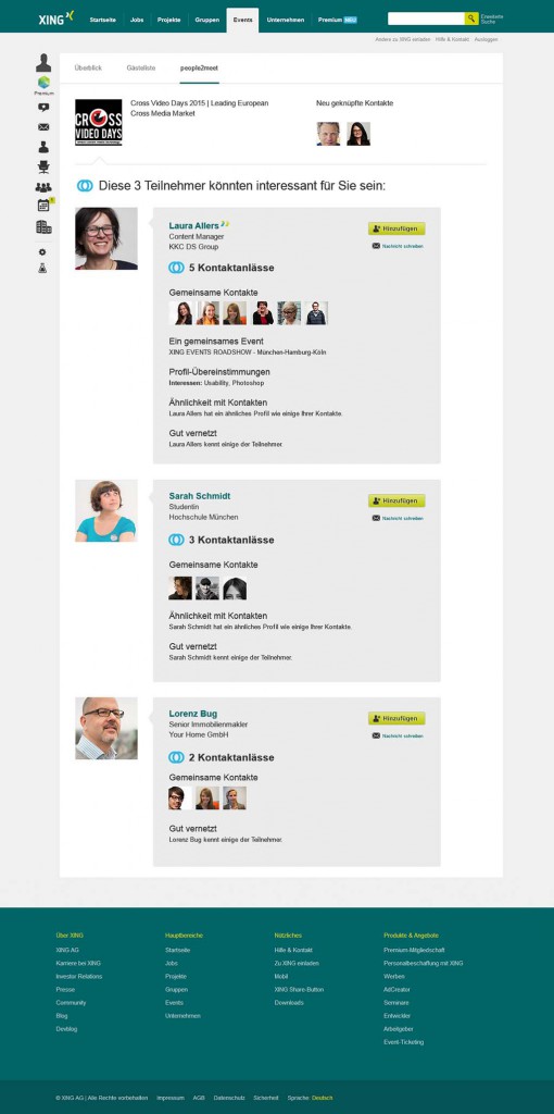 Durch die Bestätigung der Teilnahme an einer Messe auf Xing wird diese Information im Netzwerk des Mitglieds geteilt, sodass durch jede Teilnahme die Sichtbarkeit der Messe erhöht wird. Darüber hinaus wird Xing-Mitgliedern bereits vor dem Event transparent gemacht, welche ihrer Kontakte ebenfalls an der Veranstaltung teilnehmen. Außerdem zeigt Xing mithilfe der Funktion „people2meet“ auf Basis von persönlichen Profilinformationen, mit welchen bisher unbekannten Mitgliedern sich eine Vernetzung besonders lohnt. Vor allem bei Messen erleichtert dies die Terminvereinbarung für Aussteller, weil auf den ersten Blick ersichtlich ist, warum sich gerade mit dieser Person ein persönliches Gespräch lohnt.