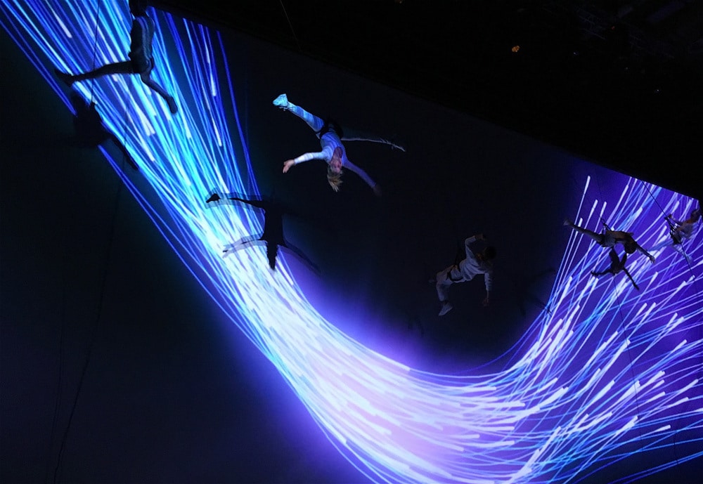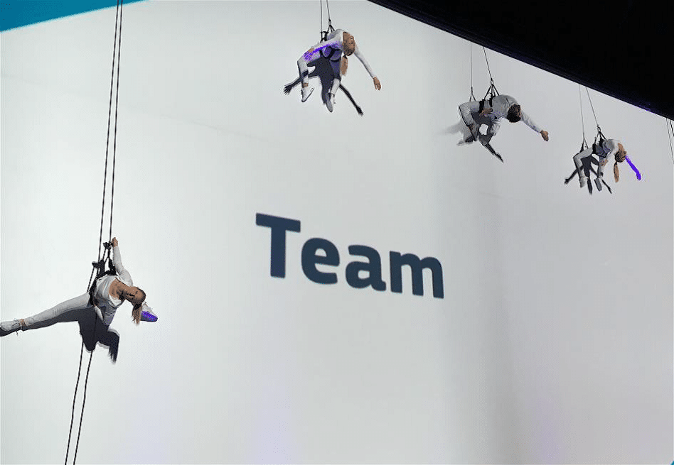 Um die Inhalte des Videos emotional zu transportieren, agierten die Artisten als Schnittstelle zu den Videoinhalten. Über individuell programmierte Seilwinden wurden die Performer exakt auf der über 20 Meter langen und acht Meter hohen Videoleinwand geflogen. Diese präzisen Bewegungen erlaubten eine perfekte Synchronisation zwischen Video, Performer und Musik. Diese außergewöhnliche Präsentation zu Beginn der Veranstaltung begeisterte nicht nur die Zuschauer, sondern dokumentierte auch die zukunftsorientierte Innovationsbereitschaft des Unternehmens.