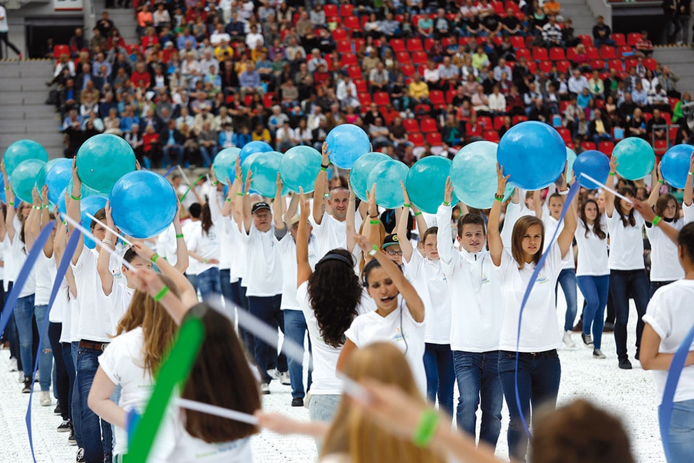 Nach intensivem Warm-Up, in dem Interviews mit Bayer Sportstars sich mit Dance-Choreografien abwechselten, startete der Countdown. Bereits in der Begrüßung des Vorstandsvorsitzenden Dr. Dekkers wurde Dank und Wertschätzung für das, was die Mitarbeiter täglich leisten, zum Ausdruck gebracht. Aber auch Stolz auf das, was Bayer ausmacht. Und davon gab es an diesem Tag noch viel zu sehen. Nach einer Happy-Birthday-Show, bei der neben Sportlern aus Bayer-Vereinen auch 150 Kindern aus Kindertagesstätten von Bayer mitwirkten, standen die Geburtstagskinder unter den Gästen im Vordergrund. Auch hier galt es wieder „ganz nah dran“ zu sein an den Menschen bei Bayer. Anschließend traten die 10 vorab durch Online-Abstimmung bestimmten Sieger des weltweiten Bayer-Song-Contest zum ersten Mal gemeinsam mit dem eigens komponierten Bayer-Jubiläumssong auf. Und nach ein wenig Übung mit Voice-Instructors sangen alle 30.000 Gäste mit. Zum Atemholen folgte eine Show am Giant Wheel. Danach erzählten dann Paare, die sich bei Bayer kennen gelernt hatten, ihre ganz persönliche „Bayer“-Geschichte. Gezielt wurden ganz unterschiedliche „Geschichten hinter den Gesichtern“ gesucht, die im Vordergrund stehen sollten.