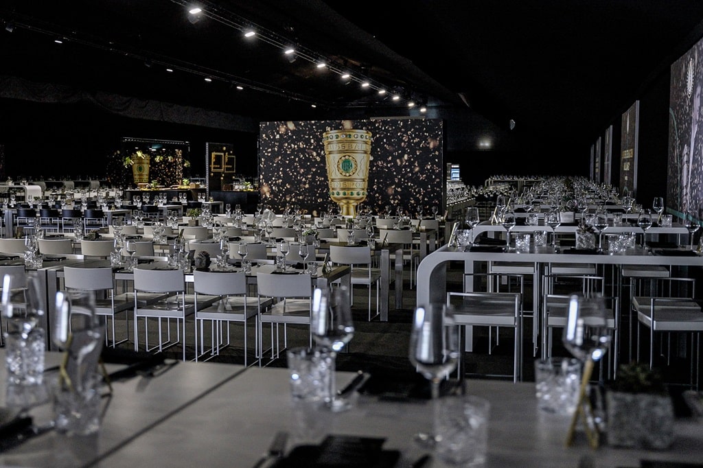 Bei den „Pokalhelden“ war ein besonders stimmungsvolles und edles Dinnersetting in Schwarz und Weiß gewünscht. An den Wänden glänzte der imposante DFB-Pokal in Gold auf großen leuchtenden Illustrationen – und verbreitete Pokalstimmung unter den VIP-Gästen.