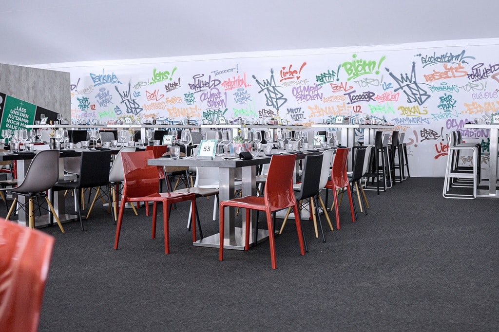 Herzog: Die Möbel mussten thematisch und von der Wertigkeit zu den jeweiligen Bereichen passen. Neben den verschiedenen Areas für Partner und Sponsoren waren die drei individuellen Konzepte das Herzstück der Hospitality-Bereiche. Das Konzept „Mythos Berlin“ war eine Mischung aus unseren Tischen Malta, Aspen und Ibiza in Verbindung mit verschiedenen Stühlen und Barhockern. So entstand ein abwechslungsreicher Mix aus verschiedenen Farben, Formen und Materialien, die dennoch ein stimmiges Gesamtbild ergaben. Die Settings mit verschiedenen Dinner- und Hochtischen entstanden vor einer großen Graffiti-Wand im Berlin-Look und verströmten so das authentische urbane Flair der Fußballhauptstadt Berlin.
