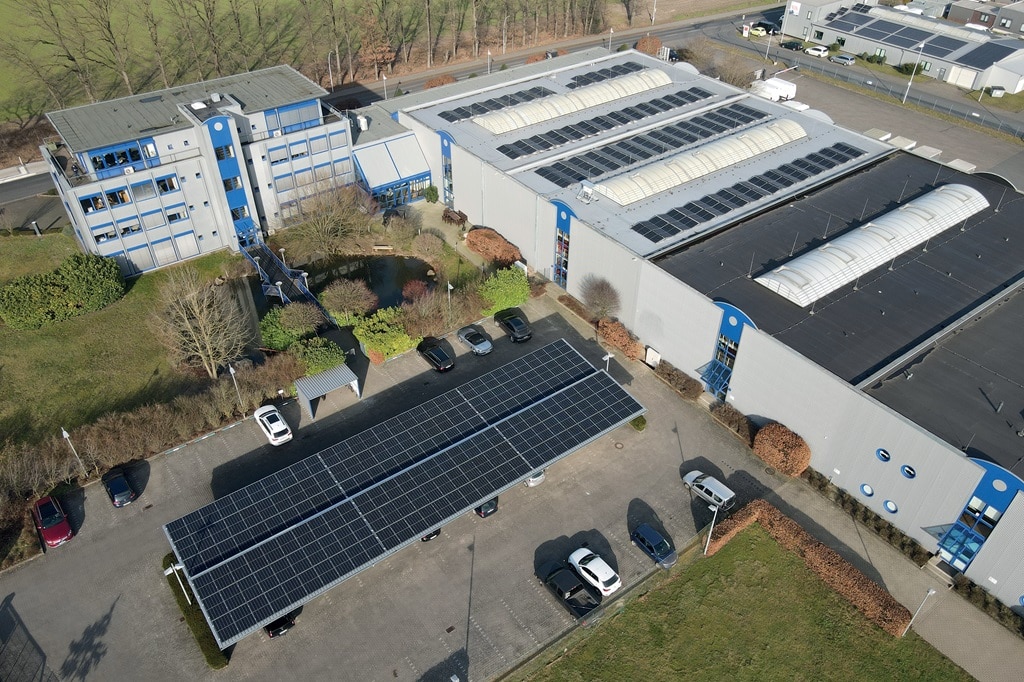 Auf insgesamt 1.400 m² Dachfläche am Standort in Emsdetten können bis zu 160.000 kWh Strom erzeugt werden. Außerdem hat die Poolgroup in einen Solar Carport investiert. (Bild: Poolgroup)