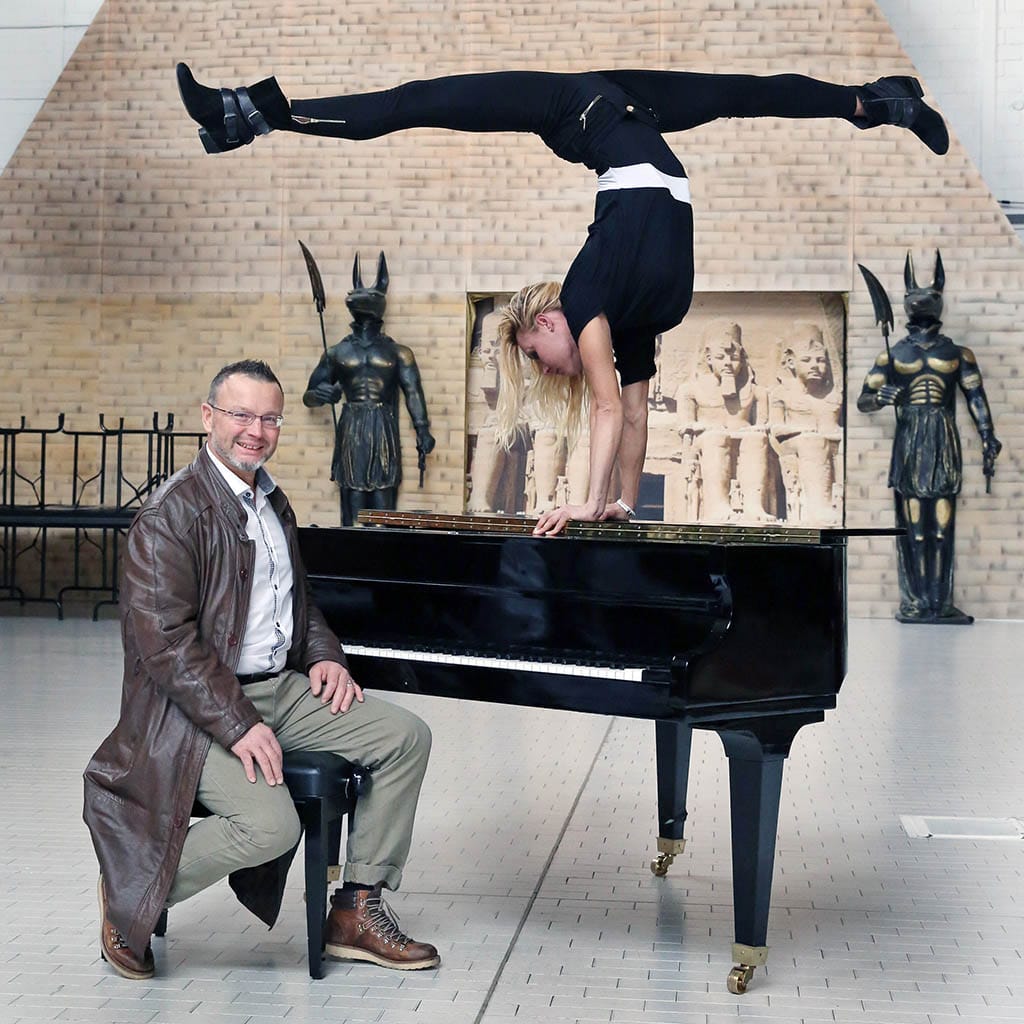 Graziös schwingt sich Natalia Macauley von Euroviva auf eine flugfähige Konzertflügelattrappe. Handstand? Kein Problem! Handstand plus Spagat und bitte mindestens eine 30stel Sekunde ohne Wackler für den Fotografen halten? Natalia Macauley schmunzelt nur, verharrt fast eine halbe Minute bewegungslos mit gestreckten Armen und dem Kopf nach unten in der kräftezehrenden Pose, während Erhard Fisoler, Geschäftsführer von Euroviva Entertainment, entspannt auf dem Klavierschemel vor der Tastatur Platz nimmt.
