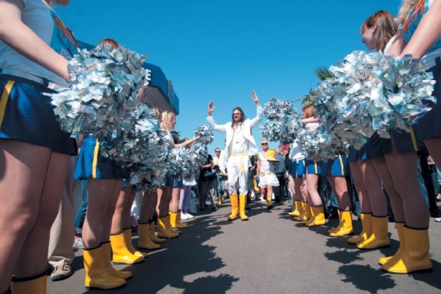 Zur Erbauung zahlreicher Schaulustiger bewies der bekannte Kölner Warmupper Marco Laufenberg dabei als „Guru Dr. Laufenberg“ mit einfachen Experimenten, was seine Fangemeinde bereits im Vorfeld auf Facebook und YouTube bestaunen konnte: Die allgegenwärtige Qi-Lebenskraft entfleucht aus durch Gummistiefel geschützten Füßen nicht, sondern verhilft Stiefelträgern vielmehr zu ungekannter Energie! Christian Seidenstücker: „Ziel war, unseren neuen Standort Düsseldorf ungewöhnlich in Szene zu setzen. Bei allem Humor steckt hinter dem Projekt auch ein ernsthafter Ansatz: Es ist ein Showcase, wie man Events mit Social Media verknüpft und erfolgreich inszeniert.“ Als direktes Ergebnis konnte sich die Joke Event AG über im Internet generierte Anfragen freuen. „Aber die Stadt haben wir mit dieser Aktion auch ein wenig aufgemischt …“, erinnert sich Christian Seidenstücker vergnügt.