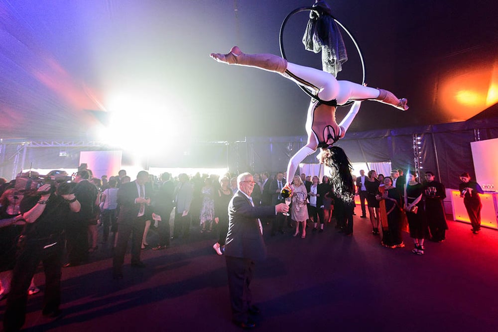 Eine Seilakrobatin unterhielt die Gäste beim Jubiläum von Pfeiffer Vacuum. (Bild: Leonard Billeke)Für das Jubiläum wurden mehrere Zelte als Location aufgebaut. (Bild: Stagg & Friends)Auch über Kopf geht kein Tropfen daneben: Eine Akrobatin schenkt einem Eventbesucher ein. (Bild: Leonard Billeke)Eventhalle beim Jubiläum von Pfeiffer Vacuum (Bild: Leonard Billeke)Tänzer beim Jubiläum von Pfeiffer Vacuum (Bild: Leonard Billeke)Pure Eleganz beim 125. Jubiläum von Pfeiffer Vacuum. (Bild: Leonard Billeke)Der Lageplan offenbart die Größe der Eventlocation beim Jubiläum von Pfeiffer Vacuum. (Bild: Leonard Billeke)