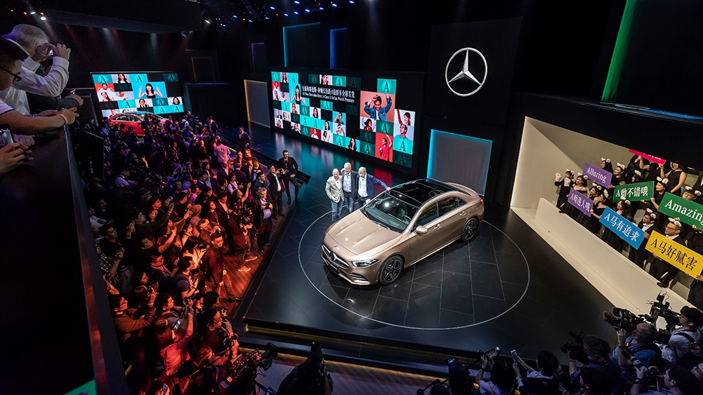 Auch größere Produktlaunches setzen in der Regel auf eine genauestens geplante Eventregie. Hier: Die Präsentation der A-Klasse L Limousine von Mercedes-Benz auf der Auto China 2018. (Bild: Daimler)