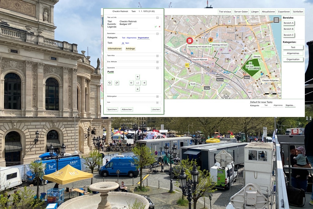Erfasste Punkte, Streckenzüge oder Flächen können in placeit mit Aufgaben versehen werden, die jederzeit Aufschluss über den aktuellen Bearbeitungsstand geben. So lassen sich sämtliche organisatorische Arbeitsschritte zeitlich verteilen und Verantwortlichen im placeit-Taskmanager zuordnen. „An dieser Stelle wird deutlich, dass unser Ansatz nicht primär ein technischer, sondern vor allem ein organisatorischer ist. Es geht darum, die Bruchstellen im Eventmanagement zwischen einer effizienten Eventvorbereitung und erfolgreichen Durchführung dauerhaft zu überwinden“, sagt Maurmann. So könnten Informationen z.B. darüber, wann und von wem im Zielbereich eines Events Mediascreens aufgestellt werden sollen, wo VIP-Trucks und Übertragungswagen wann vorgesehen sind und welche Infrastruktur hierzu bereitzustellen ist, sinnvoll aneinandergereiht werden. Auf die Kartenansichten und Aufgabenverteilung zugreifen können alle Beteiligten direkt vor Ort u.a. über ihre mobilen Endgeräte.