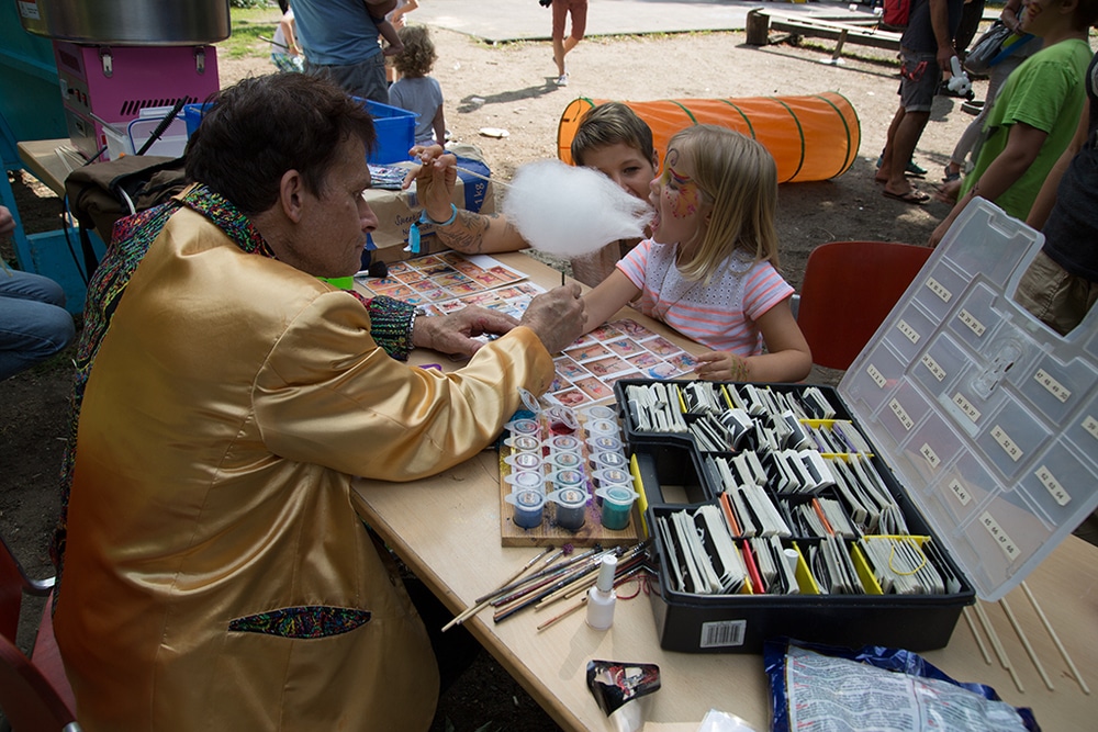 Neben vielen kontaktfreudigen Sechs- bis Elfjährigen wartete dort auch eine große Auswahl an Spielstationen, die vom Dosenwerfen über Kinderschminken bis hin zum Fotomodul reichte. Zudem gab es für die Kinder einen weiteren Ansporn: An jeder Station konnten sie einen Stempel holen. Wer im Anschluss seine Stempelkarte vorzeigte, durfte sich im Tausch auf ein kleines Geschenk freuen. Auch außerhalb der Stationen standen verschiedene Darsteller parat, die Kinder zu unterhalten, darunter Gitarristen, Sänger und ein Luftballon-Künstler. Im Comedia Theater Villa Utopia, einem umgebauten Wohnwagen, konnten die Kinder zudem selbst kreativ werden: Mit einem Lichtstift sollten die jungen Eventbesucher dort Dinge malen, von denen sie hoffen, dass es sie in der Welt der Zukunft nicht mehr geben wird. Sobald das Licht anging, verschwanden die Malereien, so wie hoffentlich ihre ungeliebten Gegenstücke in der echten Welt.