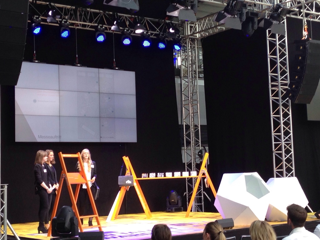 Die Architektur-Jury berät über die drei Bewerberinnen(-Teams) – und derweil kommen die Lucky Loser aus dem Eventbereich zum Zug. Die ausgeschiedenen Hochschulteams vom Vormittag dürfen dem Publikum ihre Recruiting-Konzepte für die DB im Pecha Kucha Style vorstellen. Die Zuschauer stimmen mit bunten Märkchen für ihren Favoriten, der doch noch in die letzte Eventrunde einziehen darf. Kleiner Aufruhr inbegriffen: Scheinbar wurde seitens offizieller Seite manchen Hochschulteams eine Zeit von sieben Minuten je Vortrag anstatt der Pecha-Kucha-üblichen fünf Minuten mitgeteilt. Manche Gruppe bekommt daher von Aljoscha Höhn nach heißer Diskussionen sieben Minuten ermöglicht, die BiTS darf eine Minute „nachtragen“.
