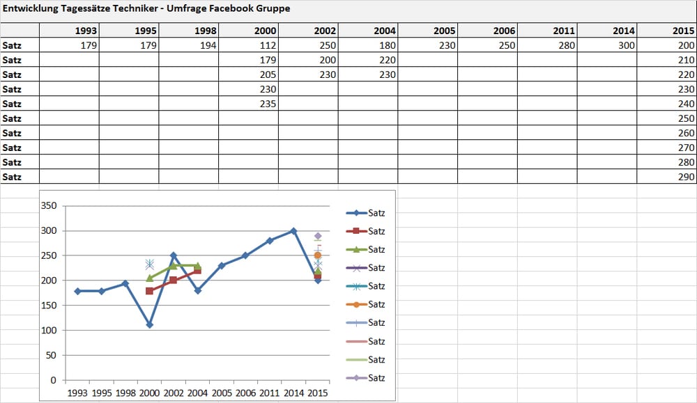 In einer nicht repräsentativen Umfrage in einer relevanten Facebook-Gruppe erfragte Falco Zanini u.a. die Entwicklung der Tagessätze von freien Technikern über die Jahre hinweg.
