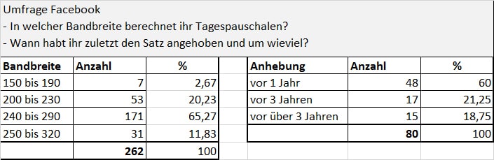 Außerdem wollte er in selbiger Umfrage die Bandbreite der verlangten Tagespauschalen der selbstständigen Veranstaltungstechniker wissen, wie auch deren Steigerung: