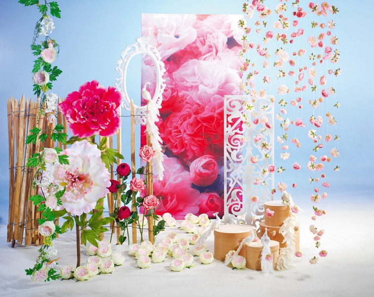 Blüten: Der Klassiker unter den Deko-Ideen ist auch bei Woerner nicht wegzudenken. Ganz vorne mit dabei ist die Rose, die im Landhaus-Trend ihre romantischen Akzente setzt. Sie erscheint auf Banner gedruckt und aufgenäht auf Stoffen, als Ranke und Blüte der Sorten Pfingst- und Teerose von Streuware bis zu XXL-Größe. Als langstielige Rose in Pink und Rosa, geschlossen und geöffnet, präsentiert sie sich in weißen Fiberglas-Vasen. Feine Textil-Rosenblätter von Weiß über Rosé bis Rot lassen sich variabel einsetzen.