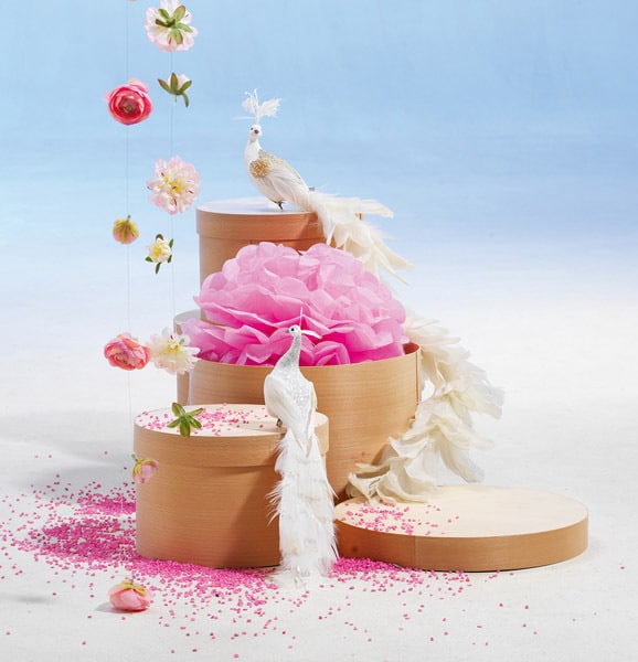 Vogelkäfige im Vintage- und Antiklook dienen eher als Warenpräsenter. Übergroße Hartschaum-Federn mit Perlmuttglanz in Rosa und Lila sowie zartrosa oder mintgrüne Papierfächer können als zusätzliche Inszenierungselemente genutzt werden.
