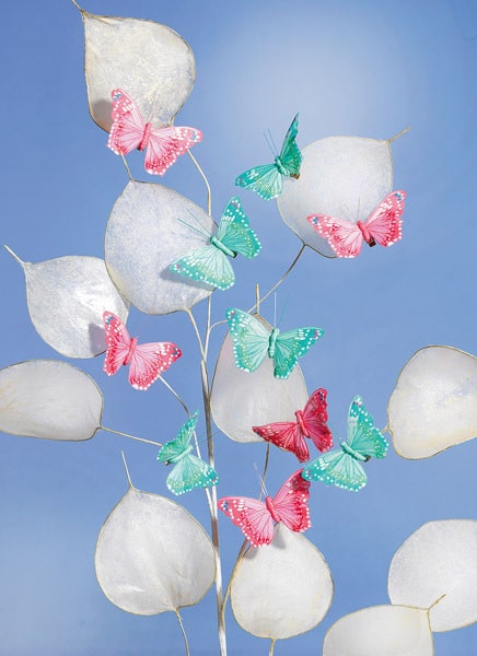 Im Trend liegen jetzt durchscheinende Varianten, deren Innenflächen milchig-transparent, die Außenkanten dagegen farbig sind. Schmetterlinge aus Chiffon, beglimmert und mit Pailletten, Falt-Schmetterlinge aus zart bedrucktem Papier, Feder-Schmetterlinge mit schöner Zeichnung sowie Schmetterlings-Ketten und Clip-Schmetterlinge sorgen für eine breite Anwendungsmöglichkeit.