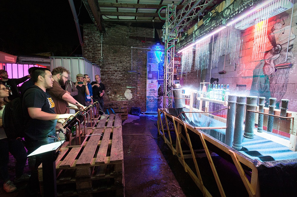 Ein unbestrittenes Highlight war der musikalische Wasserdrucker „Drop the Beat“, der ebenfalls wie das Gitter im „Heinz Gaul“ präsentiert wurde. Das ist der jüngste und improvisierte Szene-Hotspot, den die Platine ausgewählt hatte, um ihn zu bespielen. Im Hof des ehemaligen Metallhandels war ein sehr spezielles, interaktives Musikinstrument aufgebaut. Die Soundmaschine besteht aus einem Wasserdrucker mit 120 steuerbaren Ventilen und einer Vielzahl an darunter positionierten Klangkörpern. Das sind Trommeln, Becken, Alltagsgegenstände. Die Energie des herabfallenden Wassers wird zur Erzeugung verschiedener Klänge genutzt. Das passiert nicht willkürlich, sondern von den Usern gespielt wie eine Orgel: „So wird live eine Partitur generiert. Das resultierende Musikstück ist immer anders und immer einzigartig.“ Drop the Beat von Grosse8 feierte auf dem Platine Festival seine Premiere und war der Publikumsmagnet. Es war die wohl sinnlichste wie humorvollste Installation.