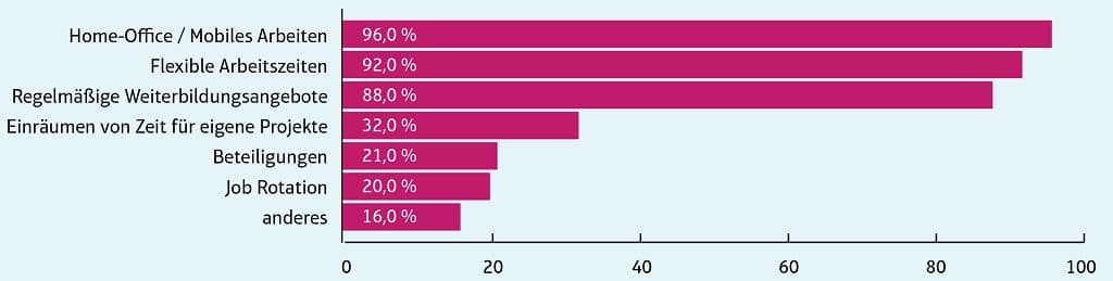 Aus einer Job-Studie von StepStone, an der im September und Oktober 2020 28.000 Fach- und Führungskräfte in Deutschland teilgenommen hatten, geht wiederum hervor, dass die branchen- und generationsübergreifend wichtigsten Benefits für Mitarbeiter:innen neben Gehalt und Jobsicherheit Familienfreundlichkeit, flexible Arbeitszeiten und eine hohe Work-Life-Balance seien. Letztere wird in der R.I.F.E.L.-Umfrage nicht berücksichtigt. (Weitere Studien betrachten wir weiter unten.)