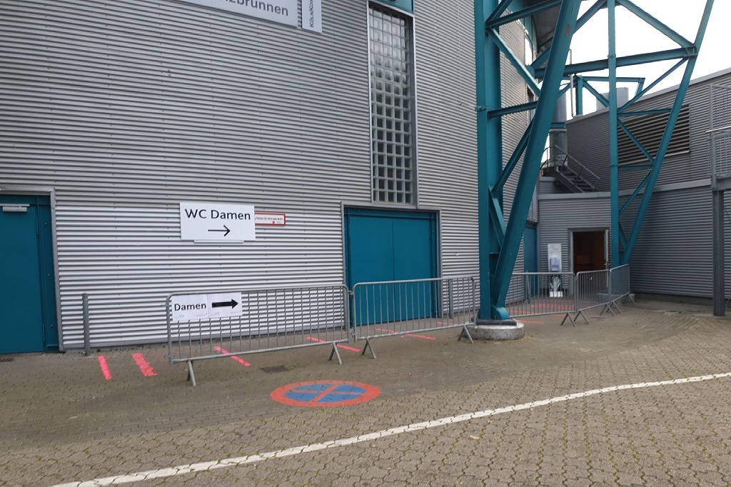 Für die Wege zu den Toiletten sowie vor den Getränkeständen wurden Einbahnregelungen eingerichtet und durch Bodenmarkierungen und Abtrennungen gekennzeichnet. An einer Stelle konnte eine nicht benötigte Notausgangstür geöffnet und so ein mit Absperrgittern abgegrenzter, zusätzlicher Eingang geschaffen werden. Dadurch, dass zu beiden Seiten des Besucherblocks WCs und Getränkeausschänke vorhanden waren und für den Auslass ebenfalls ein zusätzlicher Ausgang geöffnet wurde, konnten die Besucherströme gut auseinander und die Personendichte so an den kritischen Punkten gering gehalten werden. Auch diese Maßnahmen wurden von den Besuchern gut angenommen.