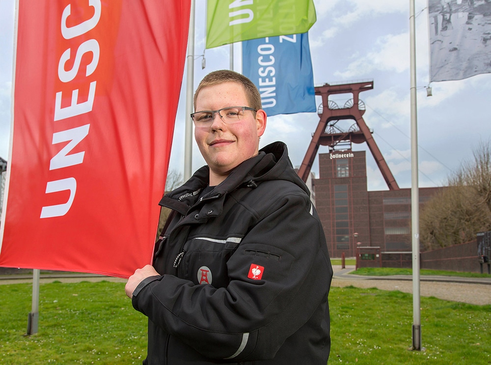 Als Jens Lohmann an den Fahnenmasten vor dem zentralen Eingang zum UNESCO-Welterbe Zollverein eine neue Flagge hisst, wandert sein Blick nach oben zum berühmten Doppelbock Fördergerüst der Zeche Zollverein. Stolz spiegelt sich in seinen Augen. Seit Januar 2014 arbeitet der mittlerweile 20-Jährige auf dem Welterbe Zollverein. Gemeinsam haben die Stiftung Zollverein und die GSE, Gesellschaft für soziale Dienstleistungen Essen mbH, einen betriebsintegrierten Arbeitsplatz für ihn geschaffen. Bei dieser Art der Anstellung können Menschen mit Beeinträchtigungen in einem Unternehmen ihren Berufswunsch verwirklichen und werden dabei durch einen Träger, in diesem Fall die GSE Werkstätten, unterstützt. Seit dem letzten Jahr ist Jens Lohmann Teil des Facility-Management-Teams der Stiftung Zollverein, zuvor unterstützte er das Team des Besucherzentrums in der ehemaligen Kohlenwäsche. Bei jedem Wetter ist er auf dem 100 Hektar großen Gelände unterwegs und sorgt dafür, dass Besucher Informationsmaterial erhalten oder legt Hand an, wenn etwas repariert werden muss.