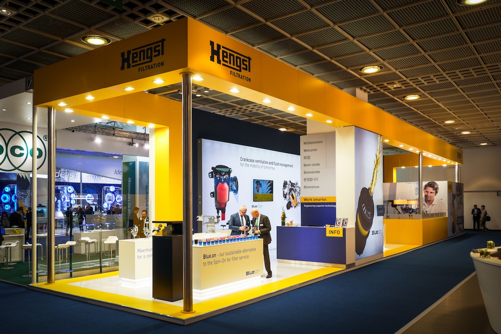 Schendel & Pawlaczyk konzipierte und realisierte den Stand von Hengst Filtration, in dessen Mittelpunkt der neue nachhaltige Ölfilter Blue.on stand. (Bild: Thomas Tratnik/Schendel & Pawlaczyk )