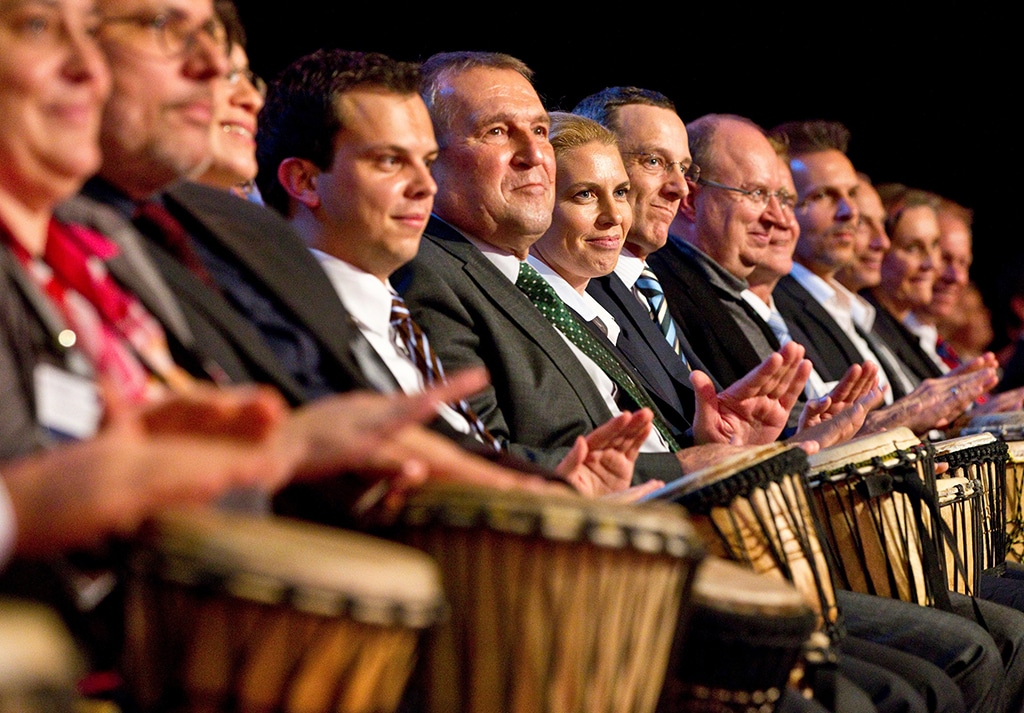 Das interaktive Trommelevent des Drum Cafes macht sich die grundlegenden Eigenschaften des Rhythmus zu Nutze und erzeugt im Rahmen einer musikalischen Interaktion ein Gefühl des Gemeinschaftssinnes. Sobald die Besucher ein erstes Mal diese Gemeinschaft spüren, beginnt die eigentliche Interaktion: Die Trommeln werden erklärt, Rhythmen gespielt, die Reaktionen der Teilnehmer eingefangen und in den weiteren Verlauf der Veranstaltung integriert. Unabhängig von der musikalischen Vorbildung der Besucher werden dabei alle Teilnehmer gleichermaßen abgeholt. Oft stößt das Team des Drum Cafes zu Anfang einer Interaktion – ob der im Business-Umfeld eher außergewöhnlichen Aufgabe – auf Skepsis. Sobald aber einfache Rhythmen erprobt werden und die ersten Klänge sich zu strukturieren beginnen, löst sich diese anfängliche Skepsis in Begeisterung und den Mut auf, mehr zu erreichen. Darauf aufbauend werden die Rhythmen anspruchsvoller, während auch der gemeinschaftliche Erfolg wächst. An dieser Stelle tritt die Quintessenz dessen, worum es eigentlich geht, zu Tage: Die innere Verbundenheit der Teilnehmer zu fördern und gleichzeitig die Persönlichkeit des Individuums zu stärken, indem der persönliche Beitrag zum Ganzen bewusste Wertschätzung erfährt. Das hat auch Einfluss auf den Vibe innerhalb eines Unternehmens.